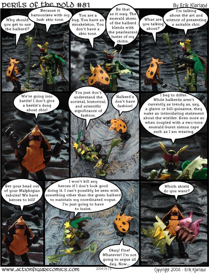 Panel #1 - Halberd: technically, the pictured weapon is not a halberd because it doesn't have the apical spike or reverse beak. Plus, it has a strange, serrated circular blade at the other end of the pole. Obviously, bipedal arthropod weapon technology has departed from our own. To learn more about halberds in human history, check out this Wikipedia entry.